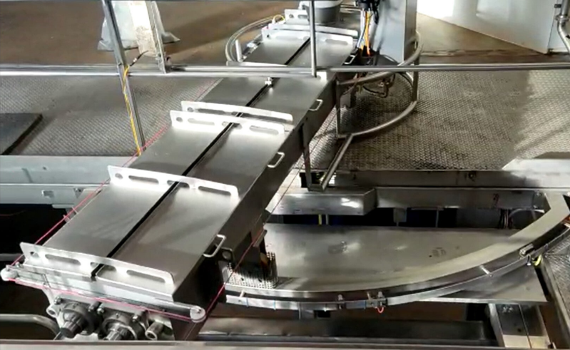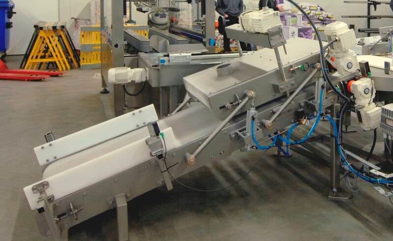 Kenmerken : fabricage en assemblage van een schuin opgestelde zakken verdichter in een voedingsmiddelen fabriek waar men papieren zakken afvult met bakpoeders. Volledig RVS constructie en opgebouwd met hygiënische kunststof schakelband. Met automatische hoogte instelling voor verschillende zakafmetingen en aandrukkrachten.