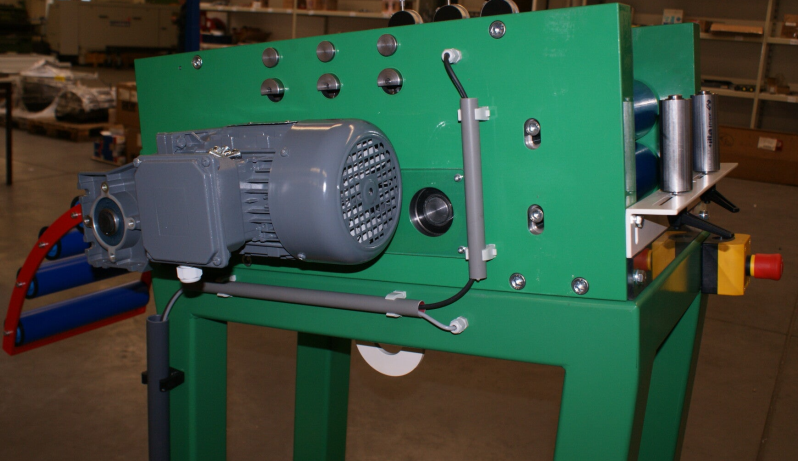 Kenmerken : fabricage en assemblage van een productielijn voor kentekenplaten. Uit een coil aluminiumband wordt de plaat eerst gericht, vervolgens voorzien van gekleurde reflecterende folie en daarna wordt de kentekenplaat gestanst.
